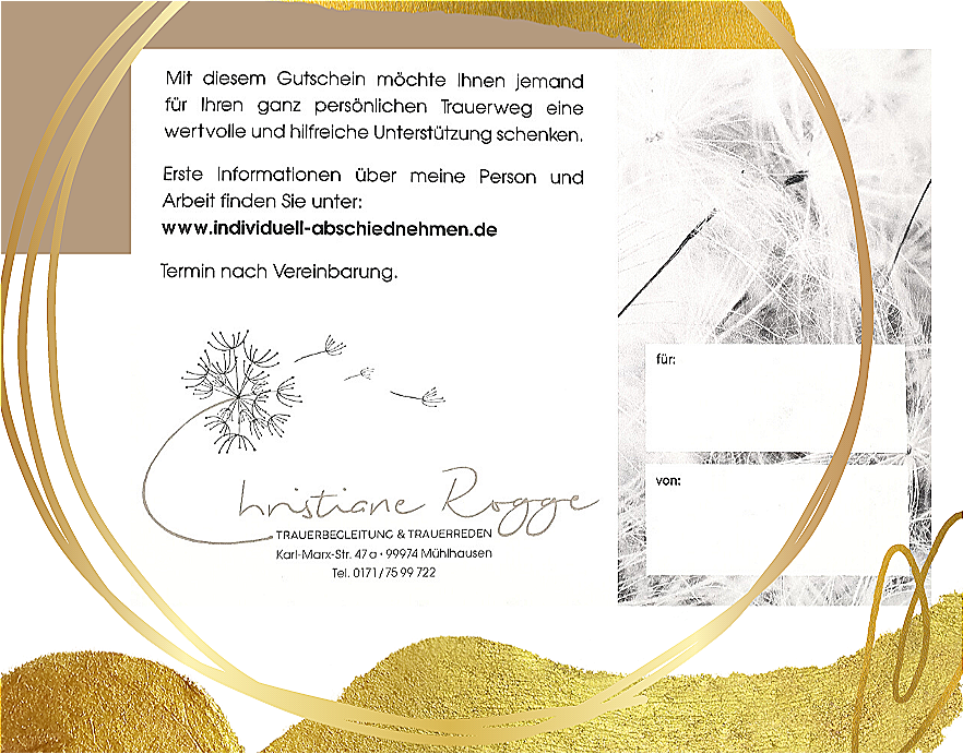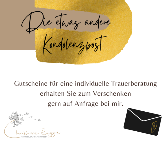 Ich möchte Sie daher ermutigen, sich für Kondolenzpost ein paar Minuten mehr Zeit zu nehmen. Denn einige wenige, persönliche Sätze fallen Ihnen bestimmt ein. Alternative Beilagen zum klassischen Geldschein könnten zudem ein Gutschein für Blumen oder eine professionelle Trauerbegleitung sein.